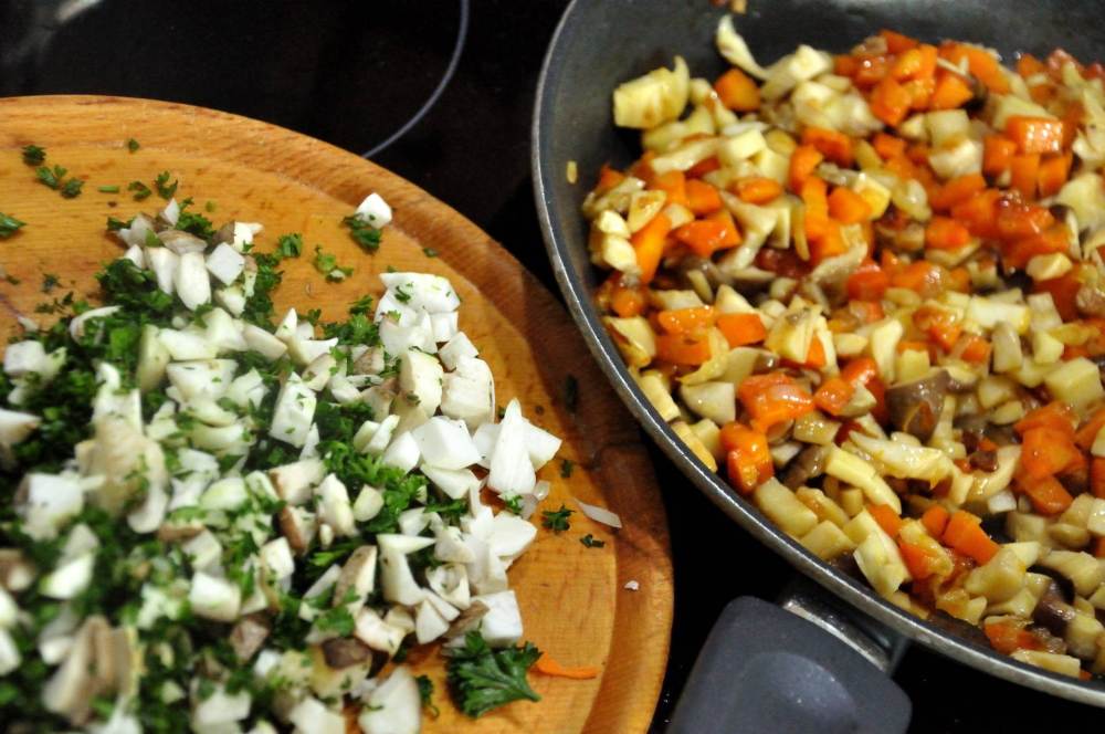 - die abgekühlte Pilzmasse einrühren, die Petersilie dazu, würzen, abschmecken