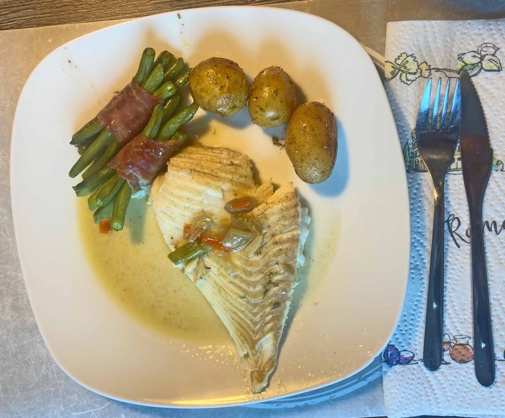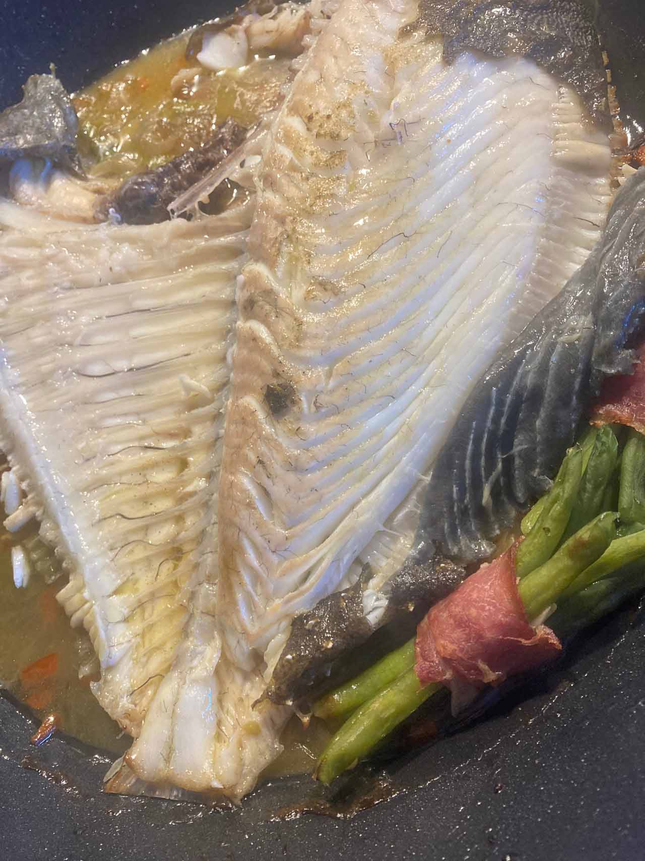 Frischer geht’s nicht. Der Steinbutt hat gerade so in die größte Pfanne in unserer Ferienwohnung gepasst, nachdem der Kopf, der Schwanz und die seitlichen Flossen abgetrennt waren. Was nicht passt, wird passend gemacht.