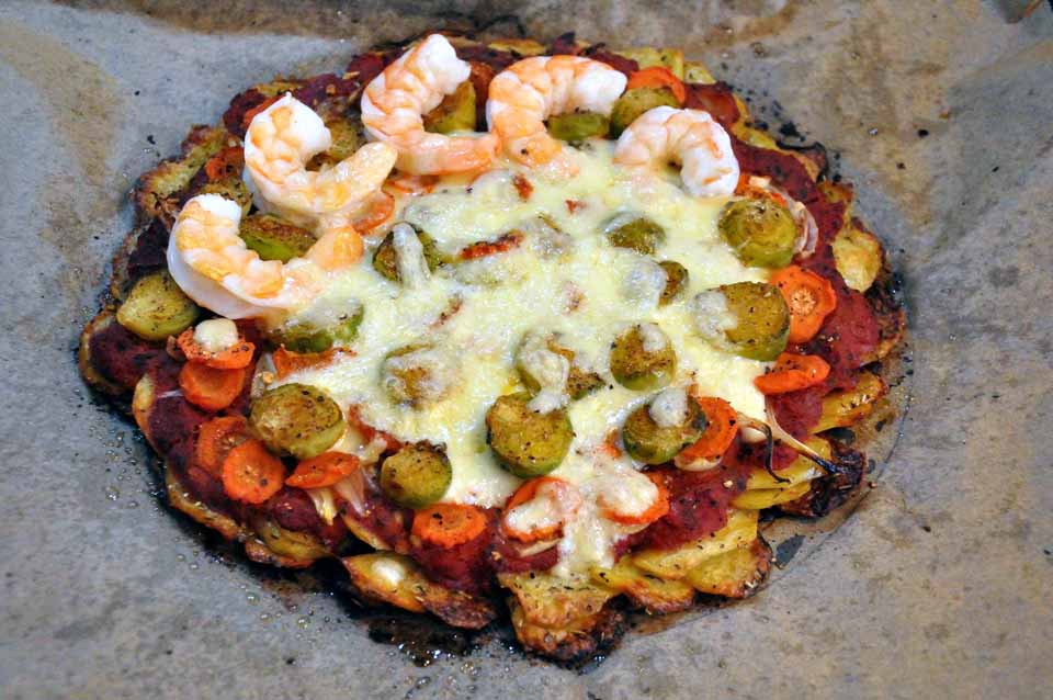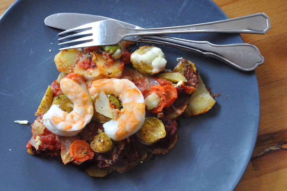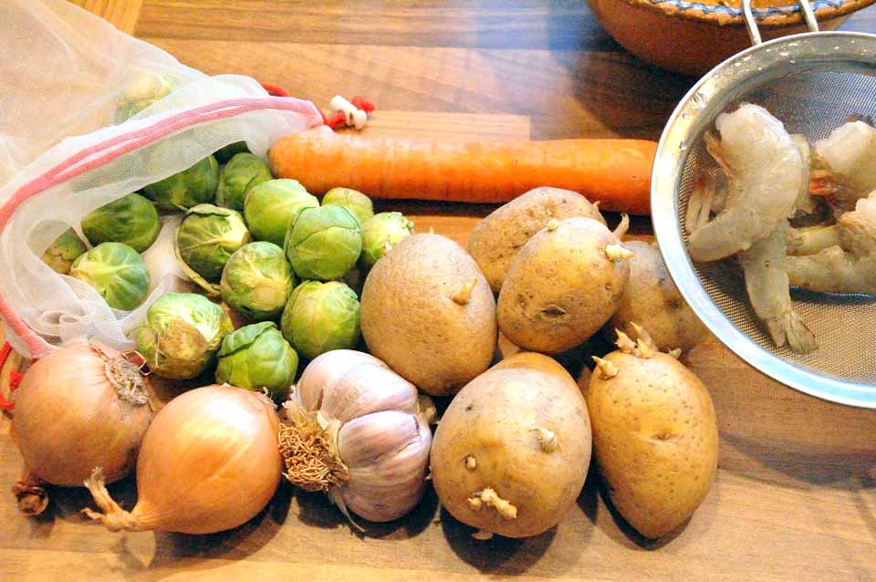 Ich habe Kartoffeln, Karotten, Rosenkohl, ein paar große Garnelen und heute eigentlich keine echte Lust zum Kochen – ein Dilemma! … und das Gemüse war nicht mehr das Frischeste!