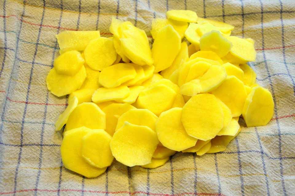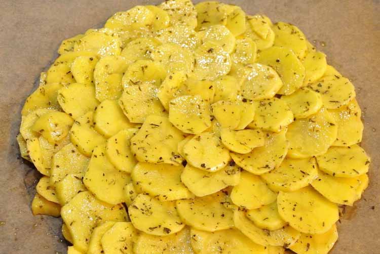 - die Kartoffeln schälen und in Scheiben hobeln, mit Salz, Kräutern und Olivenöl marinieren