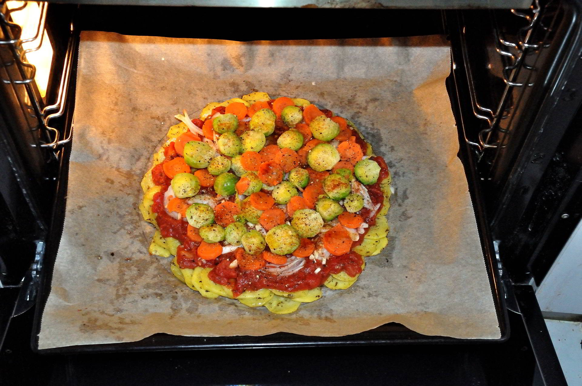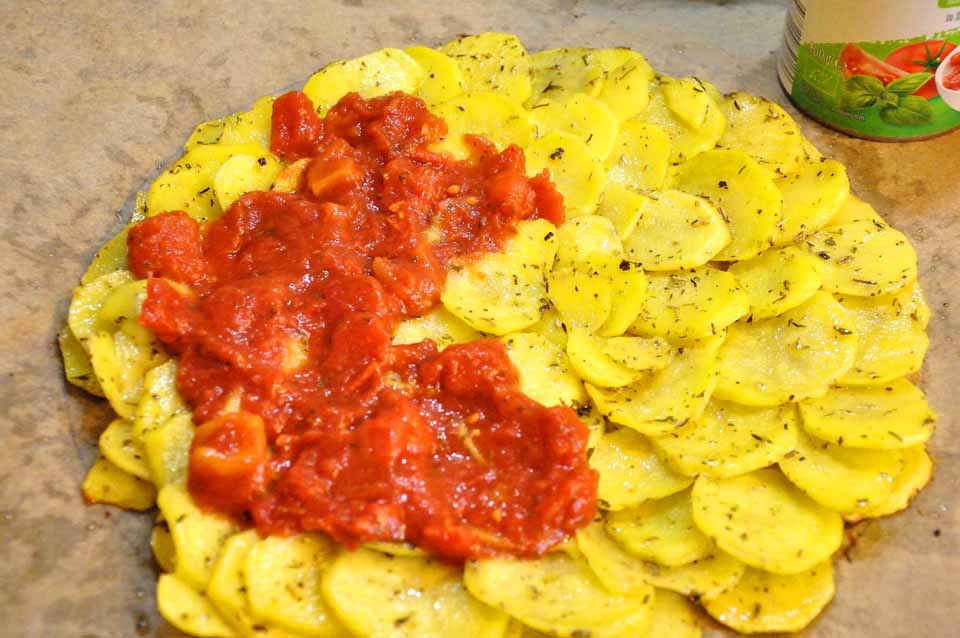 - die vorgebackenen Kartoffeln etwas salzen und pfeffern, mit den Zwiebeln belegen, die gehackten Tomaten darüber verteilen, mit Kräutern bestreuen