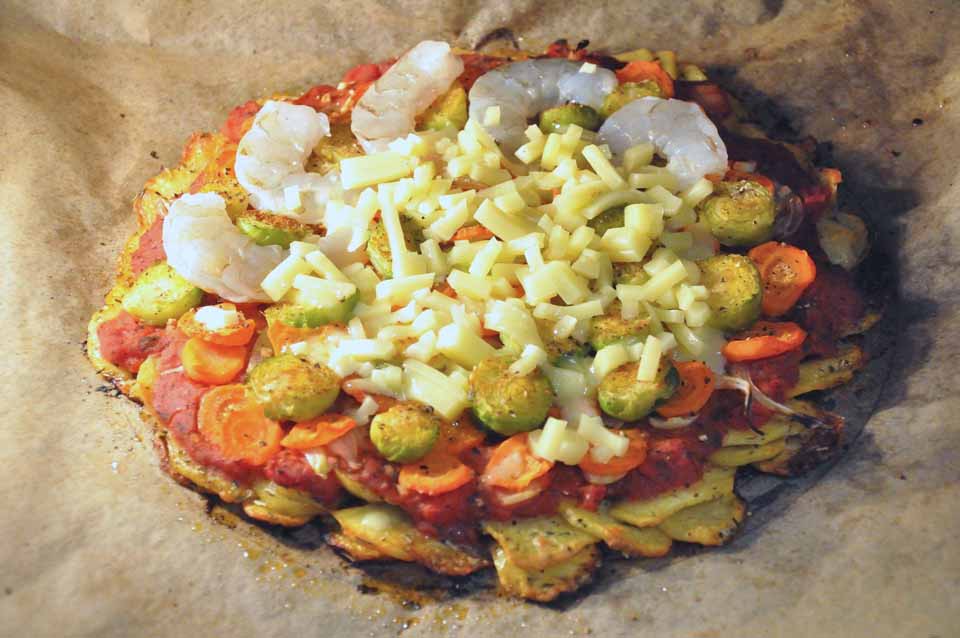 - dann die Scampi und den Käse auf der ‚Pizza‘ verteilen