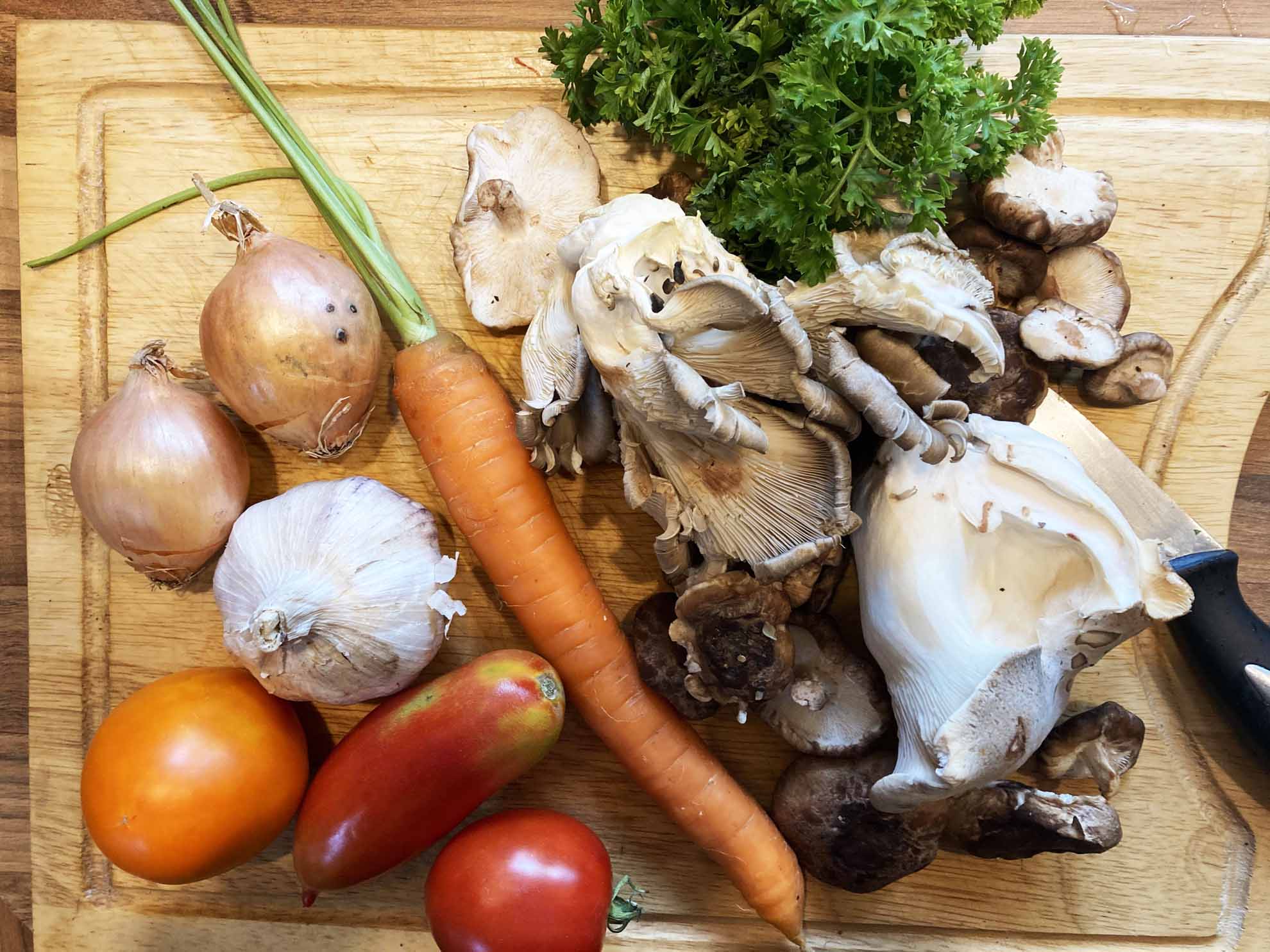 (diesmal waren es Shitake, Austernseitling und Kräuterseitling, frisch vom Pilzhof in Gündligen am Kaiserstuhl) - eine Karotte