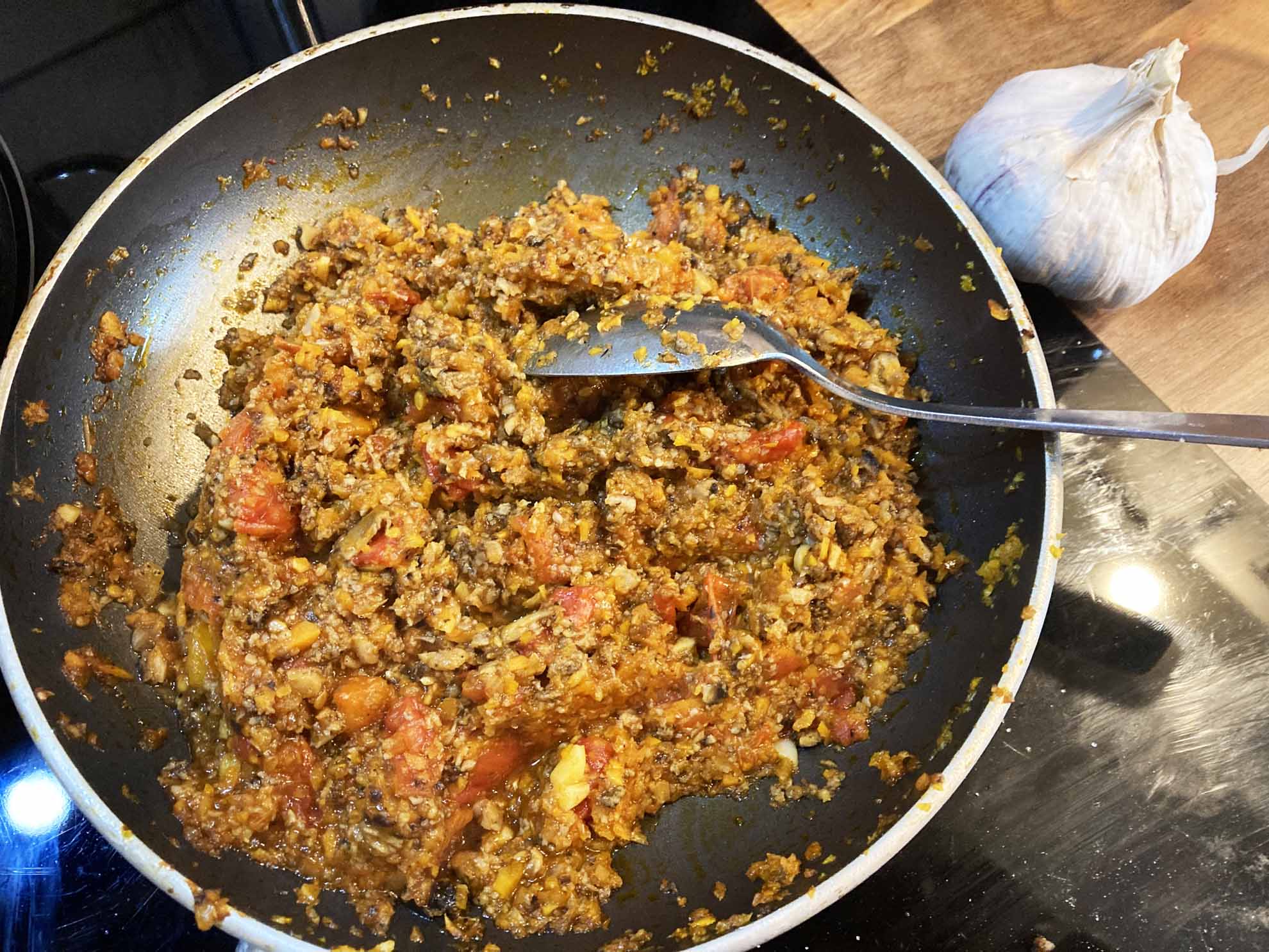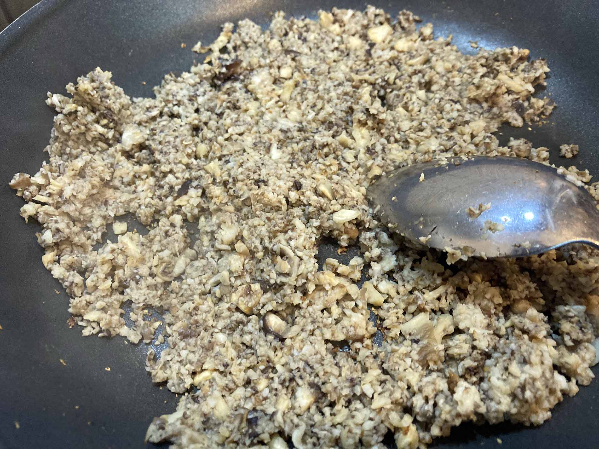 - die Pilze kleinschneiden und im Blitzhacker zu einer Hackfleisch ähnlichen Masse hacken