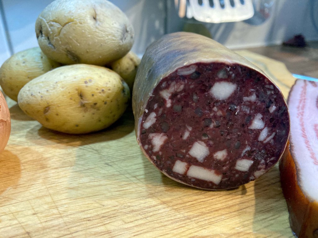 - 150 bis 200 g Blutwurst am Stück, im Naturdarm