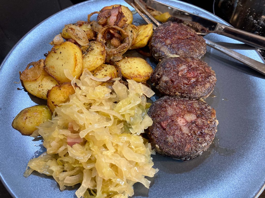Eine schöne feste Blutwurst mit Grieben im Naturdarm, Pellkartoffel vom Vortag und selbstfermentiertes Sauerkraut, Zwiebel und etwas Speck – und als Getränk ein schönes kaltes naturtrübes Feierling-Bier aus Freiburg.