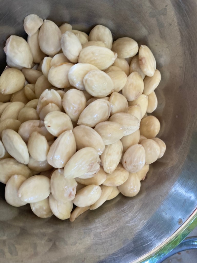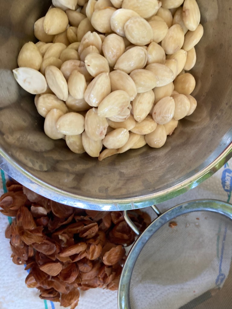 Die Knoblauchzehen schälen, die Zitrone schälen und den Saft auspressen. - Mandeln wässern, schälen und trocknen.