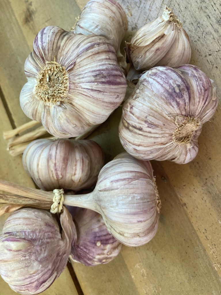 - 10 bis 12 frische Knoblauchzehen, je nach Größe am besten den rosa Knoblauch aus Lautrec – (Okay, auch hier im Breisgau gibt es guten Knobi)